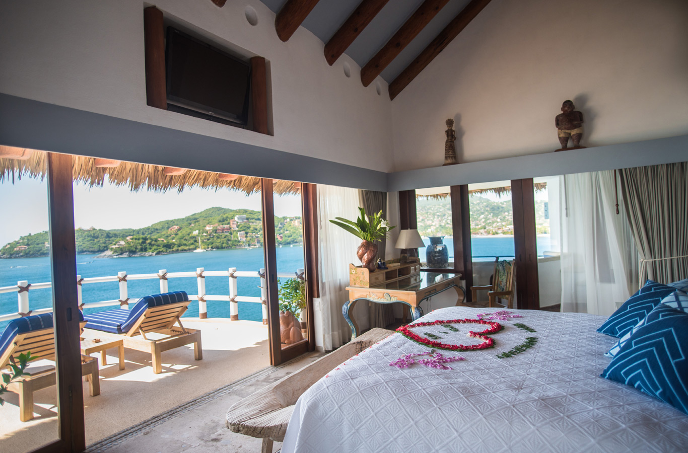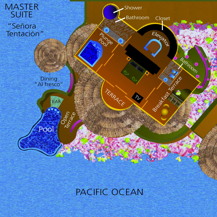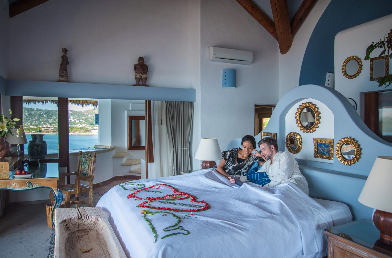 La elegante decoración, con muebles artesanales mexicanos, realza el tono azul grisáceo de las paredes y la colección de espejos dorados decorados a mano. Descanse en el balcón, desayune en la terraza o refrésquese en el plunge pool.